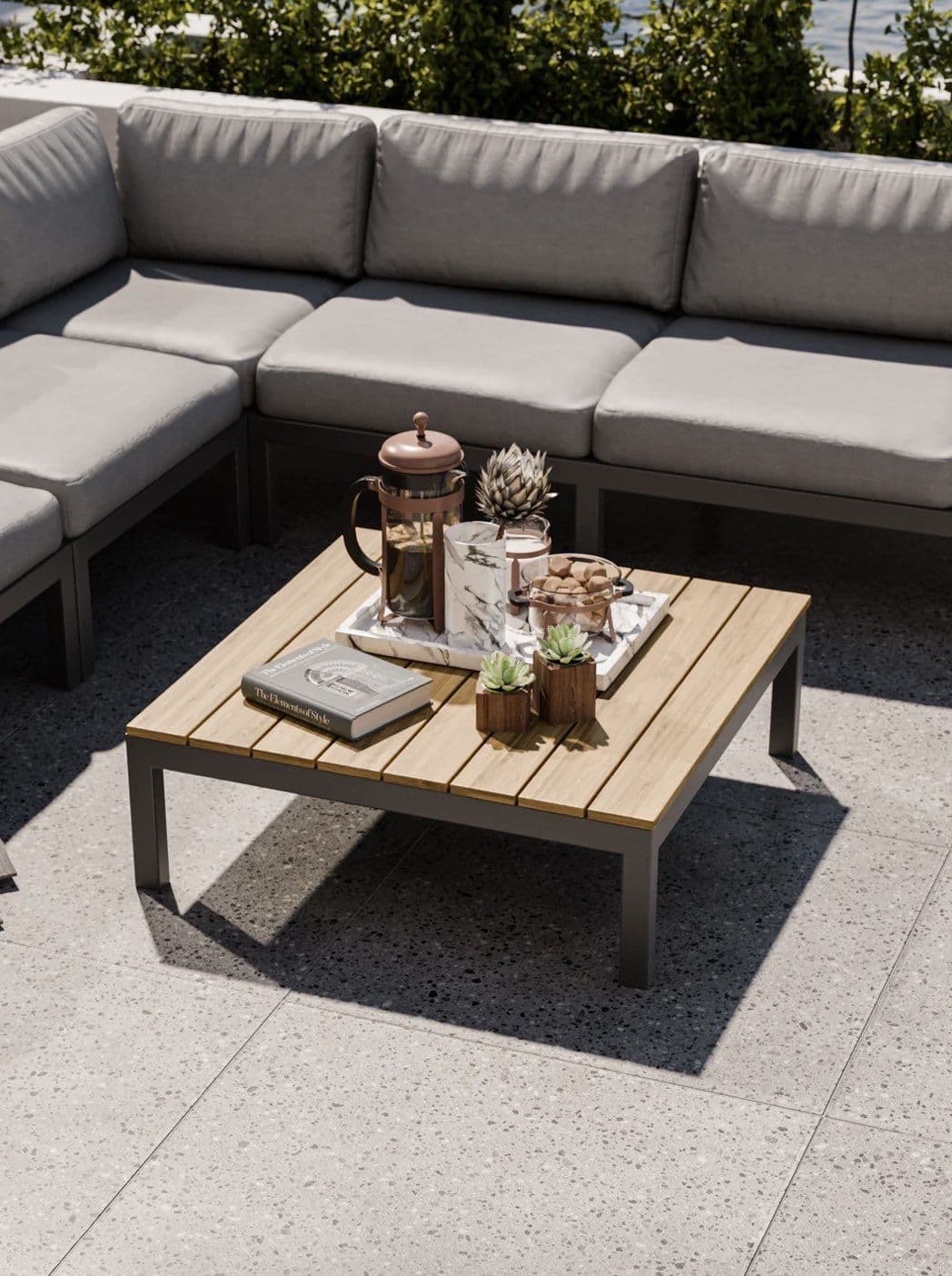 A coordinating teak coffee table completes the set, creating a stylish focal point for outdoor gatherings — whether you’re enjoying morning coffee or evening drinks with friends.